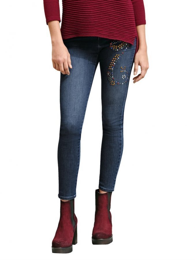 Farkut, joiden etuosassa on värikkäitä koristekiviä. Joustava ja mukava materiaali. Vartaloa korostava viistaskumalli, jossa on normaali vyötärönkorkeus. Nappi ja vetoketjusuljenta. Koon 38 lahkeen sisäpituus on n. 72 cm. Lahkeen ympärys n. 32 cm.