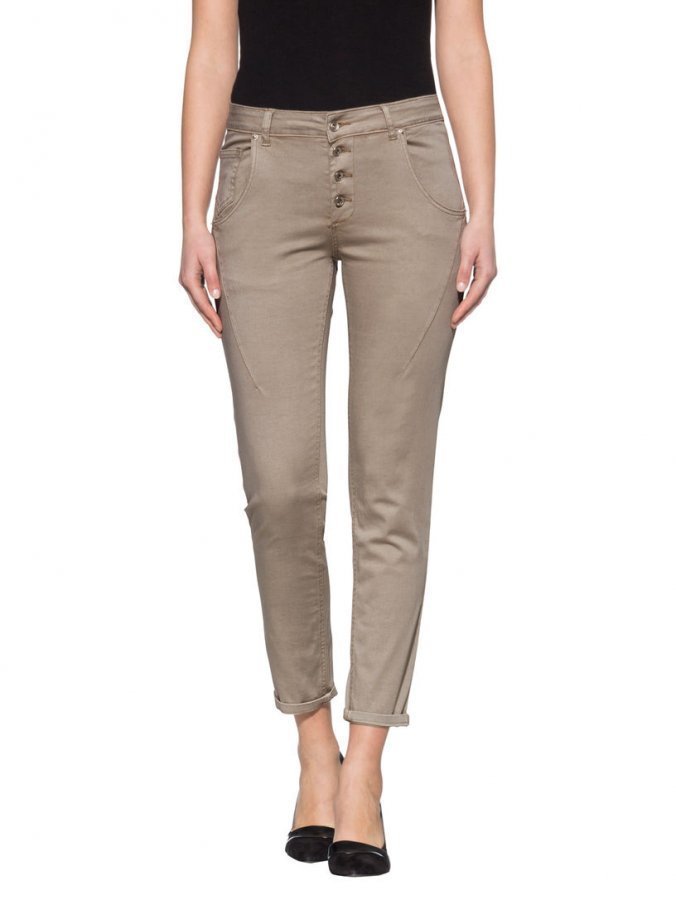 Rennon muodikkaat housut, joissa on koristeompeleet. Metallinapit, pyöristetyt taskut ja vyölenkit. Vartaloa myötäilevä malli. Koon 38 pituus n. 75 cm, lahkeen ympärys n. 32 cm.