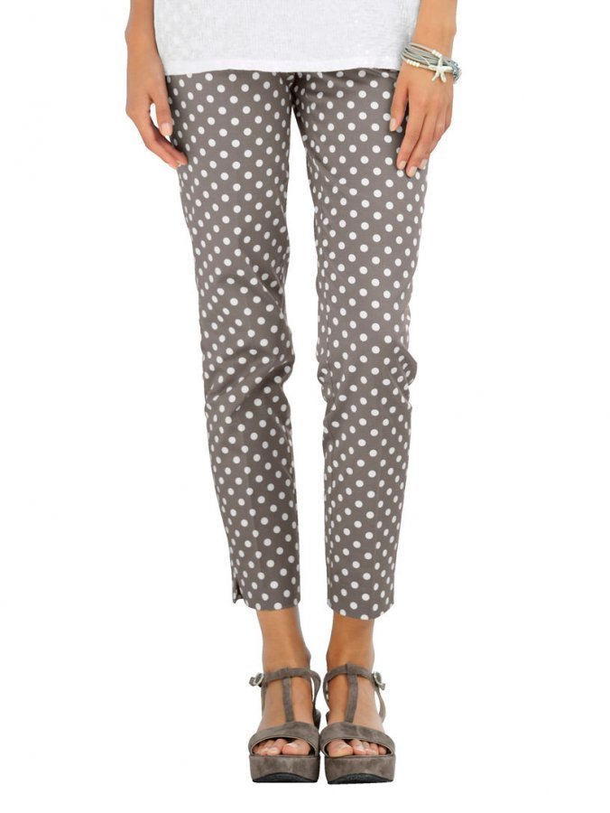 Nilkkapituiset, muodikkaasti pallokuvioidut housut kesäistä joustavaa puuvillaa. Edessä 2 avotaskua, takana 2 listataskulta näyttävää somistetta. Muotoon ommeltu vyötärönauha, jossa vyölenkit. Vartaloa korostava malli ja normaali vyötärönkorkeus. Lahkeen sisäpituus koossa 38 n. 74,5 cm. Lahkeen ympärys n. 32 cm.