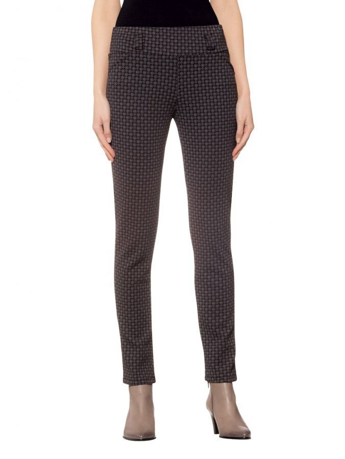 Pienikokoisella kuvioinnilla somistetut leggingsit. Vyötäröllä on istutettu vyötärökaitale, kuminauha ja vyölenkit. Viistot koristetaskut ja kapea, vartaloa korostava leikkaus. Koon 38 pituus n. 76 cm. Lahkeen ympärys n. 28 cm.