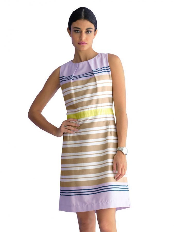Polvipituinen kesäisen raidallinen mekko himmeästi hohtavaa puuvillaa. Joustava vuori. Pyöreässä pääntiessä laskokset. Selkäpuolella vetoketju. Istuvuuden varmistavat muoto-ompeleet. Vartaloa korostava kotelomalli. Pituus koossa 38 n. 94 cm.