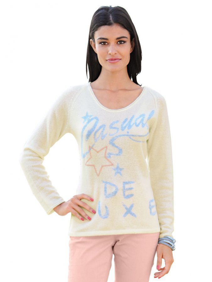 Kamirneulepusero, jonka etupuolella Alba Modan ylellinen nurjalle puolelle tehty, etupuolelle kuultava painatus (Reverse Print). Laadukasta ilmavaa neulosta. Painatusmenetelmän vuoksi jokainen neulepusero on uniikki. Vartaloa korostava malli, jossa pyöreä pääntie ja raglanhihat. Pituus koossa 38 n. 64 cm.