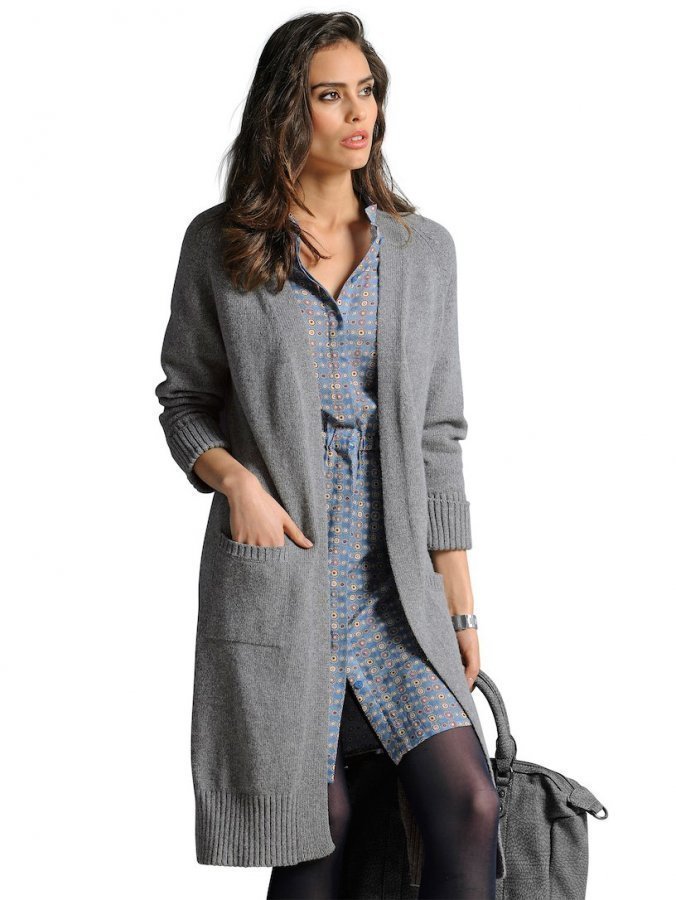 Suurisilmukkaisessa neuletakissa on trendikäs, edestä avoin malli. Sivuilla pitkät halkiot. Leveä joustinneuloshelma ja hihansuissa myös joustinneulosta. V-pääntie. Vartaloa myötäilevä, pitkähelmainen malli. Koon 38 pituus n. 100 cm.
