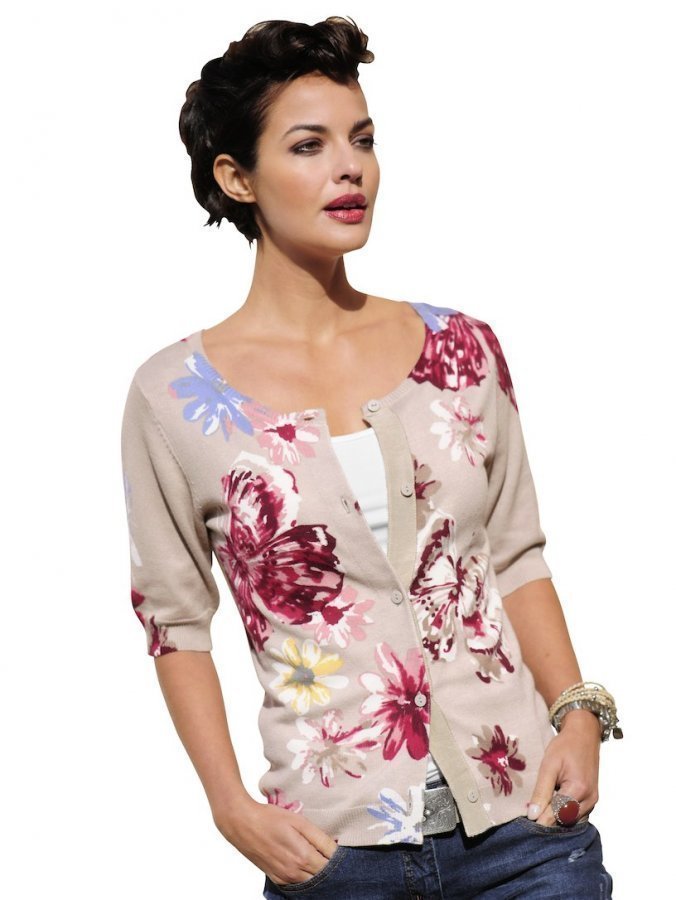 Huippumuodikas neuletakki, jossa yksinoikeudella Alba Moda -mallistolle suunniteltu upea painokuviointi. Nappilista, puolipitkät hihat ja pyöreä pääntie. Hihansuut ja helma joustinneulosta. Nappilistassa reunanauha. Vartaloa korostava malli. Pituus koossa 38 n. 54 cm.