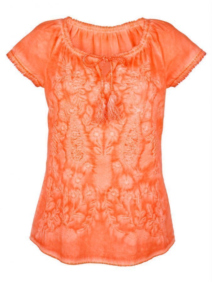 Muodikkaasti öljyvärjätty tunikamallinen pusero, jonka etupuolella näyttävä kirjonta. Pyöreä pääntie, jossa solmittavat nauhat. Lyhyet raglanhihat. Jokainen pusero on väritykseltään uniikki. Vartaloa myötäilevä malli. Pituus koossa 38 n. 62 cm.