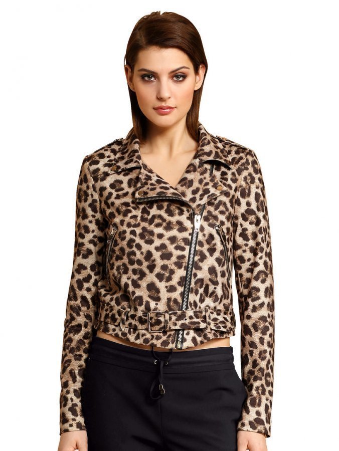 Trendikäs eläinkuvioitu bikertakki. Muodikas kaulus sekä helman vyölenkit ja irrotettava vyö ovat toimiva yhdistelmä. Kullanväriset napit ja vetoketjut tuovat viime silauksen. Pitkähihainen, vartaloa korostava malli. Muotonsa säilyttävää jerseytä. Pituus koossa 38 n. 48 cm.