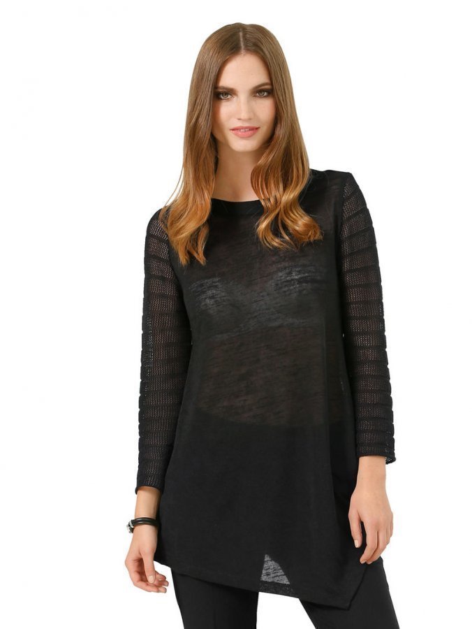 Neulepusero ohutta neulosta. Hieman helmaa kohti levenevä, vartaloa korostava malli. Pyöreä pääntie ja vajaamittaiset verkkoneuloshihat. Pituus koossa 38 n. 81 cm.