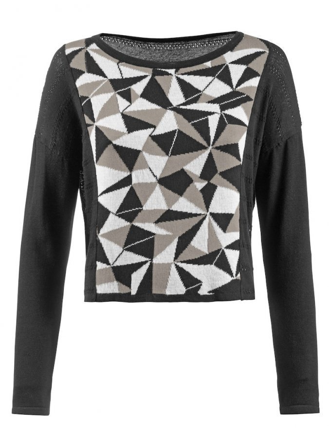 Lyhyt, kulmikas ja upeasti kuvioitu neulepusero. Pitkät hihat ja pyöreä pääntie. Sopii hyvin paitapuseron päälle. Vartaloa myötäilevä malli. Koon 38 pituus n. 54 cm.