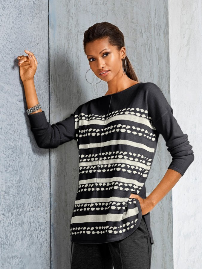 Neulepusero, jossa on kaunis kuosi. Keskiosassa muodikas sauma. Pehmeä materiaalisekoite takaa korkean käyttömukavuuden. Reunoissa putkiresorit. Etuosassa jakardikuosi. Venepääntie, pitkät hihat, laskettu hartialinja ja rento malli. Pituus koossa 38 n. 72 cm.