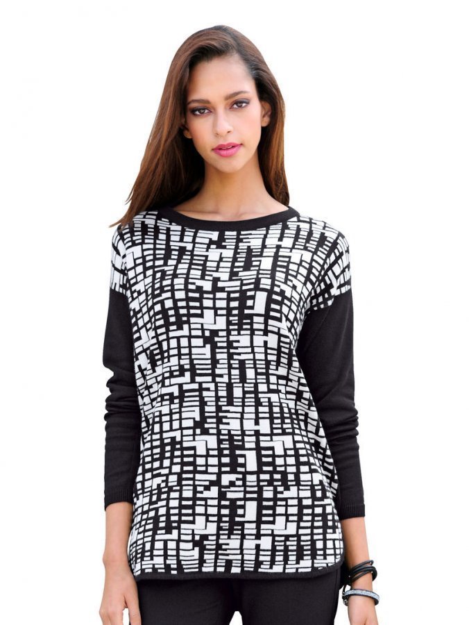 Neulepusero miellyttävän tuntuista sileää neulosta. Etupuolella graafinen jakardikuviointi. Selkäpuoli ja hihat yksiväriset. Pyöreä pääntie ja pitkät hihat. Rennosti istuva malli. Pituus koossa 38 n. 72 cm.