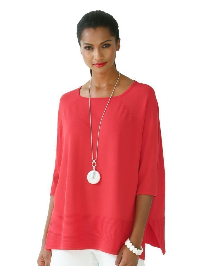 Kesäisen kevyt, pirteän värinen neulepusero helppohoitoista sileää neulosta. Muodikas, ylisuuri malli. Pyöreä pääntie ja kyynärpäät peittävät hihat. Pituus koossa 38 n. 62 cm.