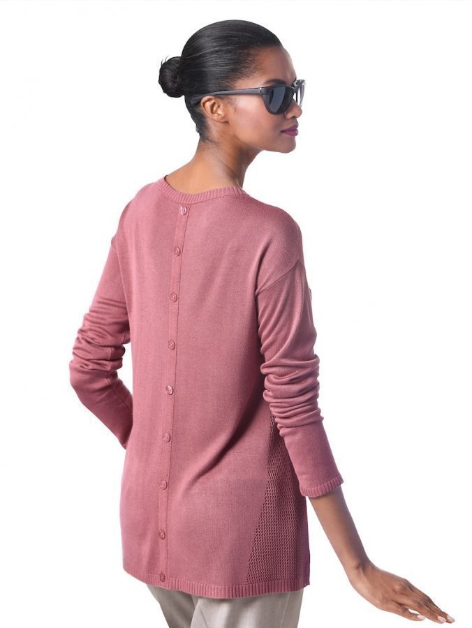 A-linjainen neulepusero, jossa V-pääntie ja pitkät hihat. Pehmeästi laskeutuvaa materiaalia. Edessä erilaista neulekuviointia. Takana keskellä koristenappilista. Vartaloa myötäilevä malli. Pituus koossa 38 n. 65 cm.