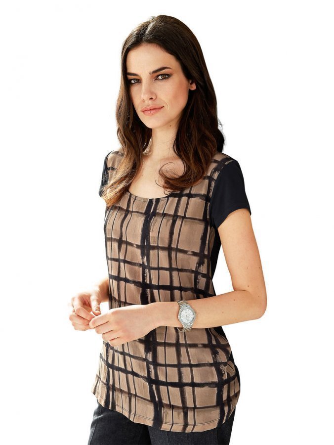 Lyhythihainen paita, jonka hihat ja selkäosa ovat yksiväristä jerseytä. Pyöreä pääntie, miehustassa painokuviointi. Vartaloa myötäilevä malli, koon 38 pituus n. 68 cm.