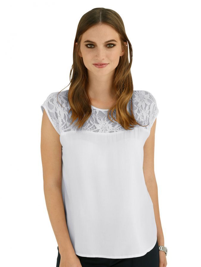 Paita, jossa olkapäiden yli ulottuva hartiasauma. Yläosassa läpikuultavaa pitsiä. Laadukas vaate moneen tilanteeseen, joko sellaisenaan tai bleiserin alla. Vartaloa korostava malli, jossa pyöreä pääntie. Pituus koossa 38 n. 62 cm.