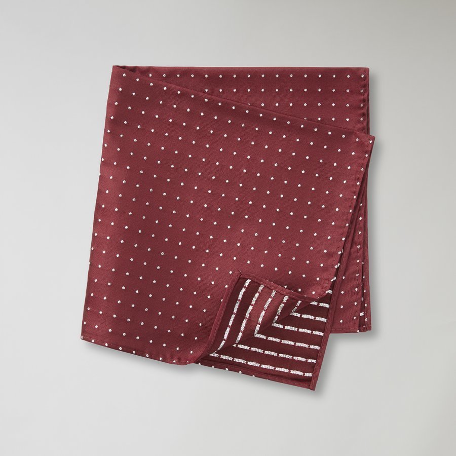 Pilkullinen punainen taskuliina merkiltä Amanda Christensen. – 33×33 cm – 100% silkkiä.