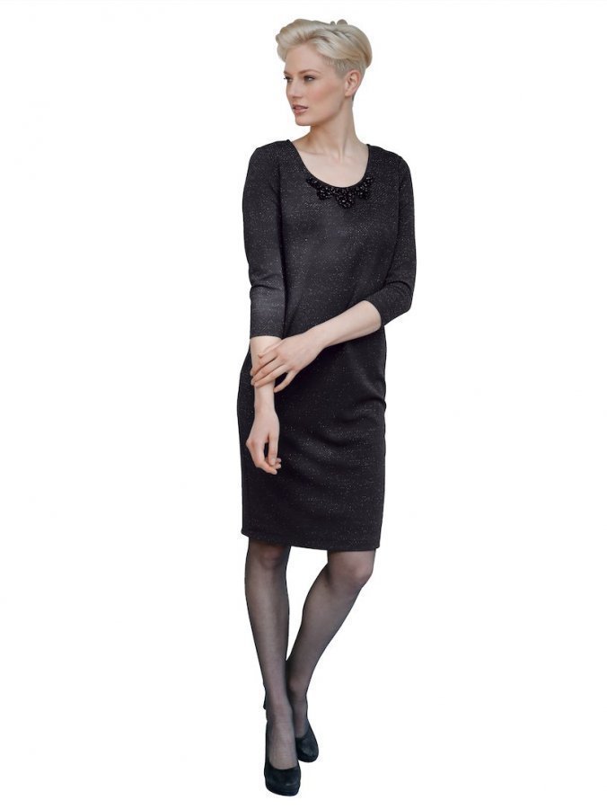 Pyöreässä pääntiessä applikaatioita. Mekossa on kimallelankaa ja paljetteja. Helppo pukea ja riisua selkäosan vetoketjusuljennan ansiosta. Suora malli, jossa on 3/4-hihat. Vuoritettu.