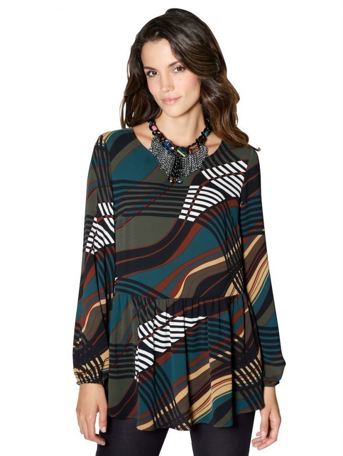 Naisellinen tunika joustavaa kangasmateriaalia. Helmaa kohti levenevä malli on laskostettu kauniisti ja muodikkaasti. Hihansuissa kuminauhakiristys.