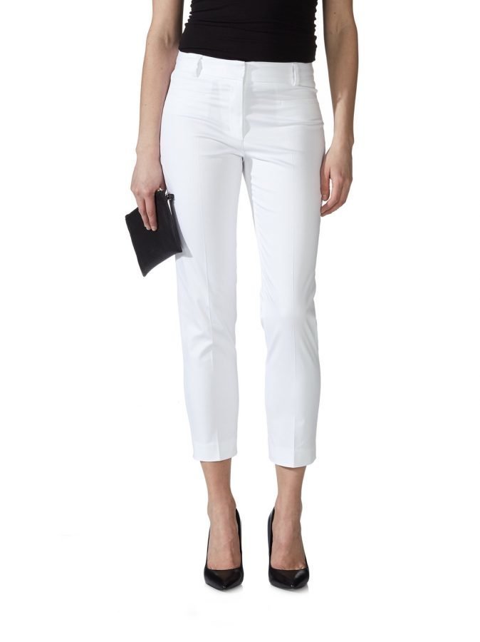 Siisteissä prässihousuissa on aavistuksen kapenevat ja vajaamittaiset lahkeet. Edessä ja takana on somistetaskut. Napakka ja hieman joustava kangas tekee housuista miellyttävän tuntuiset päällä. Housut suljetaan vetoketjulla ja kahdella hakasella.