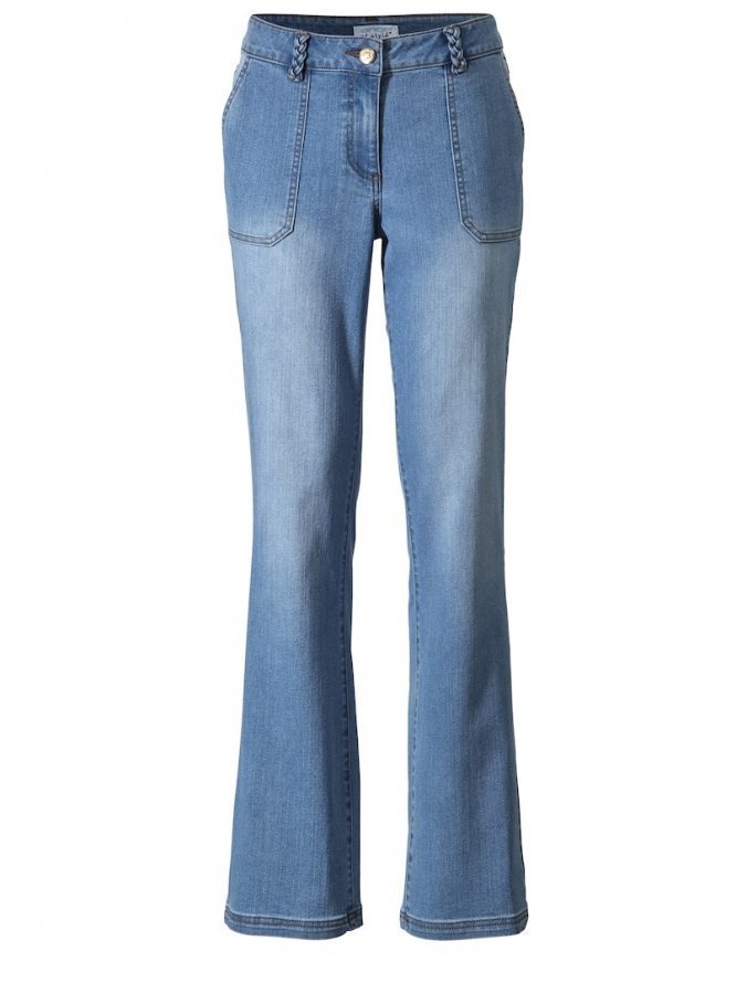 Retrotyyliset, huippumuodikkaat farkut, joissa punotut vyölenkit ja syvät etutaskut. Reisien kohdalta kuluneen näköiseksi pestyt. Flare Cut -leikkaus ja hieman alaspäin levenevät lahkeet. Joustava, muotoon ommeltu vyötärö.