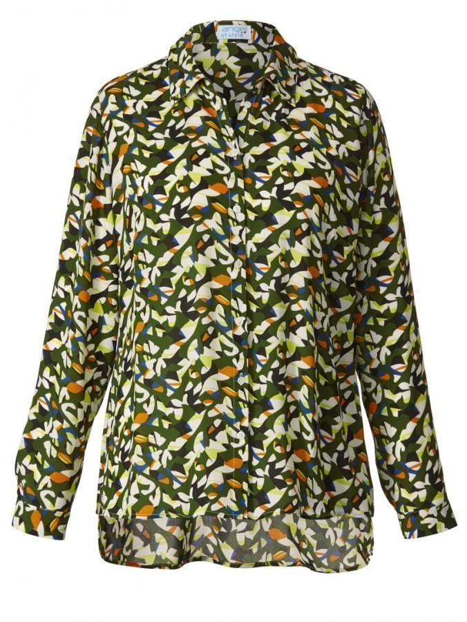 Trendikäs paitapusero, jossa on näyttävä painatus. Materiaali on kauniisti laskeutuvaa georgettea, joka myötäilee mukavasti vartalon linjoja. Edessä nappisuljenta. Pyöristetty helma ja pidennetty selkäosa.
