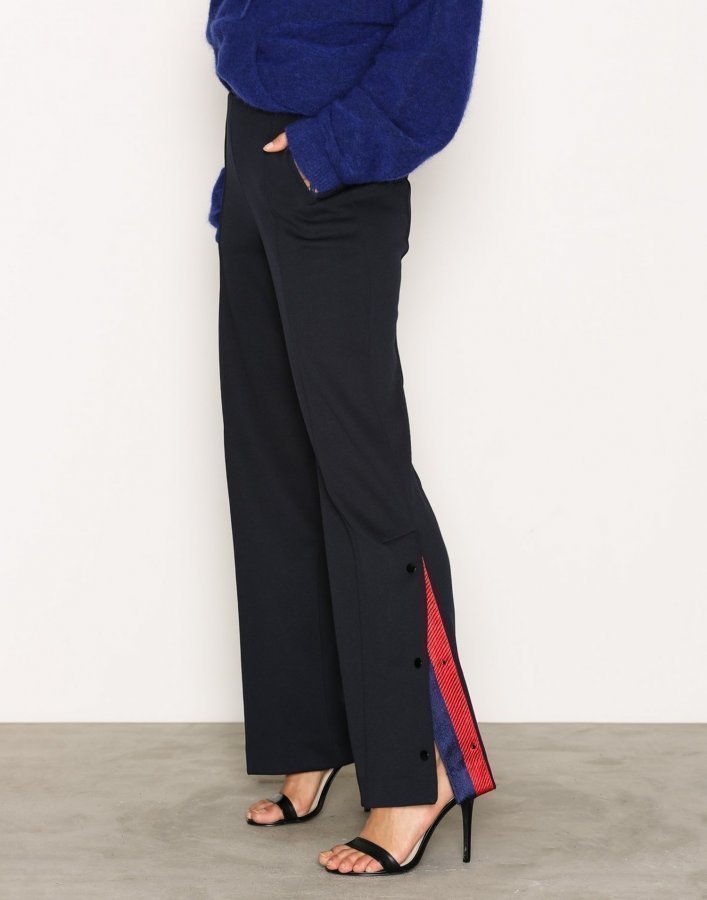 By Malene Birger housut. Väljä, joustava malli vyötäröresorilla. Vetoketjulliset taskut sivuissa edessä. Korkea halkio nappi-kiinnityksillä molemmissa lahkeissa. Koristeelliset saumat edessä ja takaa. Valmistettu 55 % Polyesterista ja 45 % Puuvillasta. Tuotenumero: 630720-0877. Väri: Midnight. Kategoriaryhmä: Vaatteet / Housut & Shortsit / Housut. Koot: X-Small, Medium, Large, Small. Kohderyhmä: Naiset.
