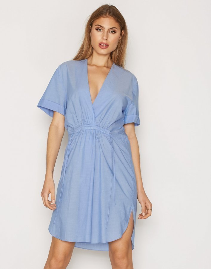 By Malene Birger mekko. Lyhythihainen, suora malli kietaisu v-aukolla edessä. Koristeellinen drapeeraus edessä sekä halkiot sivuhelmoissa. Valmistettu 50 % puuvillasta ja 50 % modaalista. Malli: Malli on 176 cm pitkä ja käyttää kokoa EU 34. Tuotenumero: 630639-0989. Väri: Blue. Kategoriaryhmä: Vaatteet / Mekot / Loose fit dresses. Koot: EU 34, EU 36, EU 38, EU 40. Kohderyhmä: Naiset.