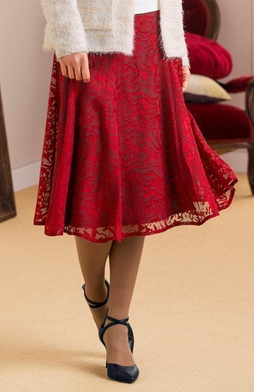 Kellotetussa hameessa on läpikuultava kuviointi. Kokovuorattu tehostevärisellä vuorella. Leveä muotoonommeltu vyötärö jonka sivulla… Lue lisää »
