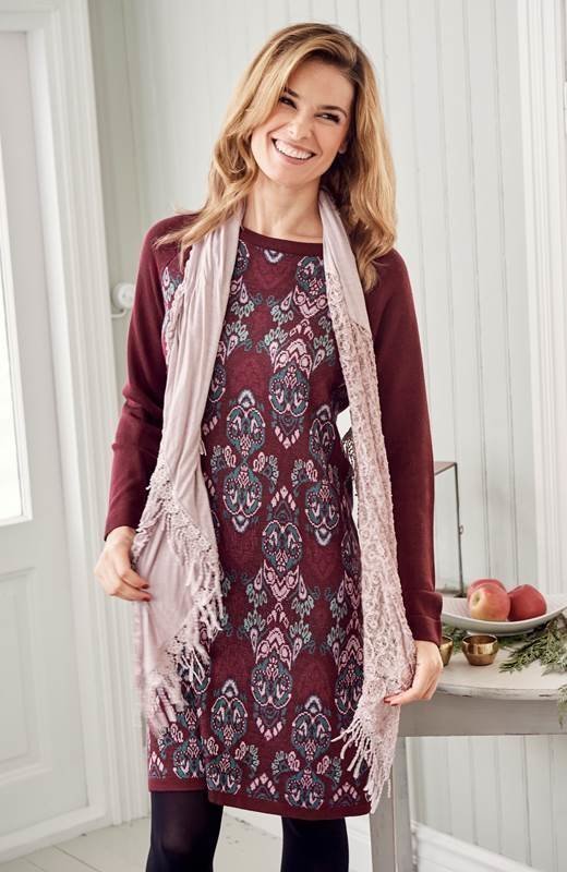 Jacquardneuloksinen mekko, sileäneuloksiset raglanhihat. Pääntiessä, hihansuissa ja helmassa resori. Pituus n. 92 cm,… Lue lisää »
