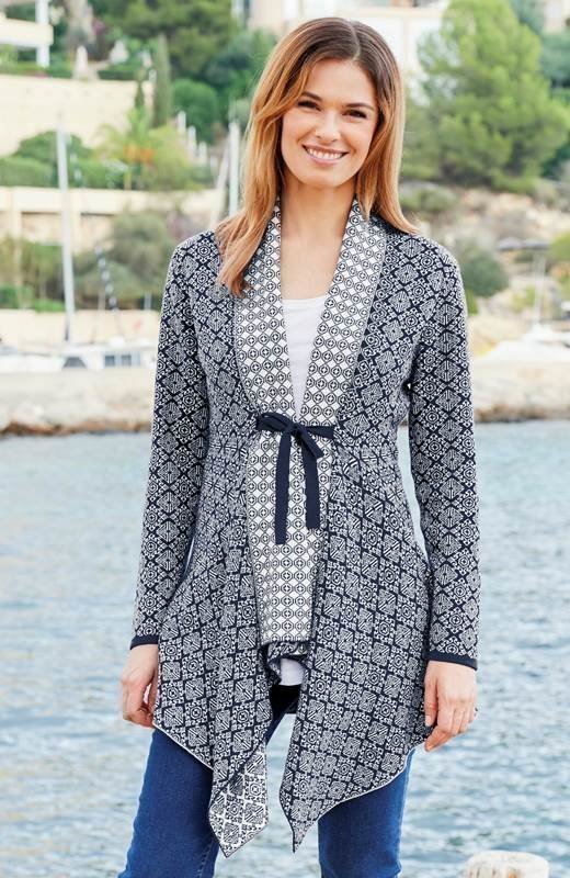 Hienoneuloksinen kaksivärinen neuletakki, jacquard-kuviota. Huivikaulus sekä sidosvyö vyötäröllä. Selän pituus koon mukaan n…. Lue lisää »