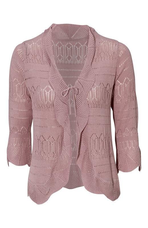 Kauniisti kuvioneulottu neuletakki 3/4-hihoilla. Avonainen edestä, pieni shaalikaulus. Hieno aaltomainen reuna hihansuissa ja… Lue lisää »