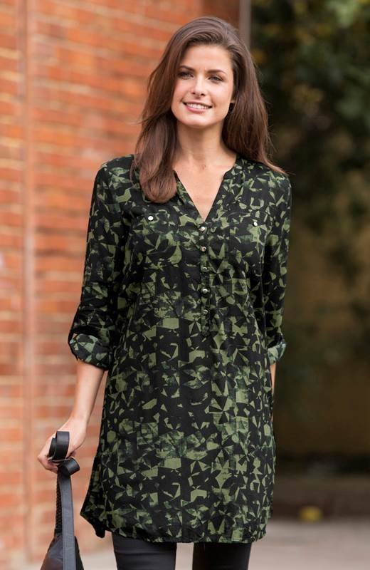 Kuvioitu pusero pehmeää neuleviskoosia. V-pääntie ja pieni pystykaulus. Lyhyt napituslista jossa hopeanväriset napit…. Lue lisää »