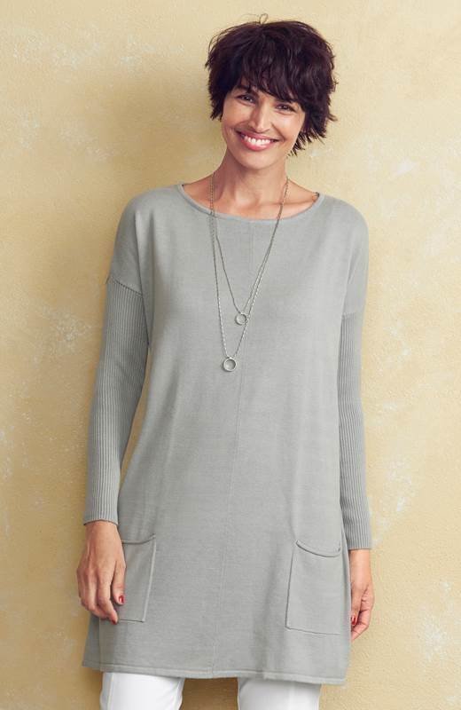Sileäneuloksinen tunika, rento malli, ribbineuloshihat. Ribbineulosta venepääntiessä ja helmassa. Taskut edessä pienillä rullareunoilla…. Lue lisää »