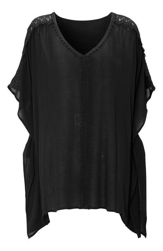 Mukava tunika, kreppineulosta. V-pääntie, suloinen pitsireunus edestä keskellä helmaan asti. Lyhyet perhoshihat jossa… Lue lisää »
