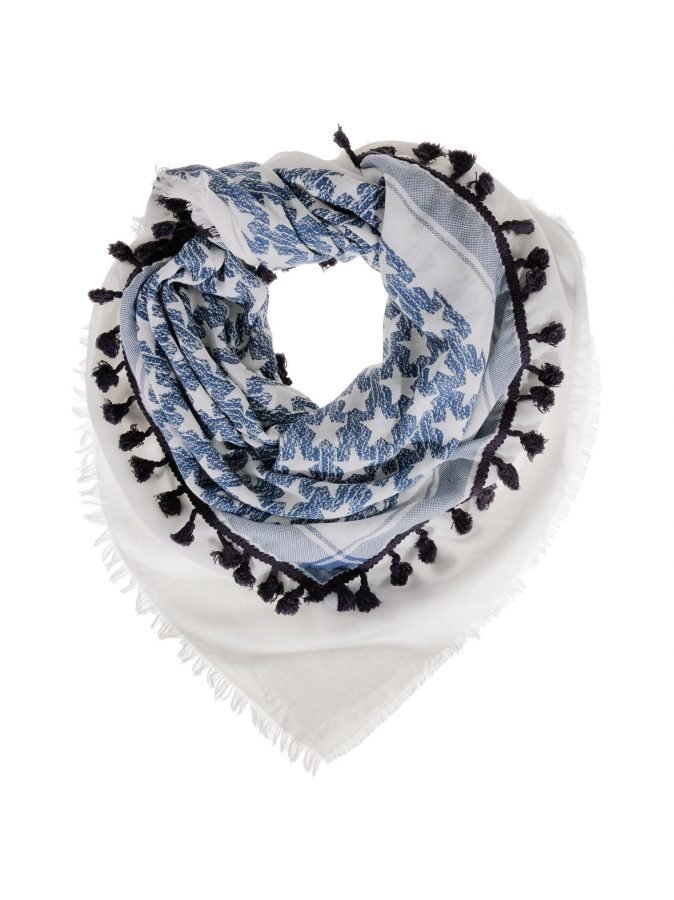 Codellon kevyessä huivissa on raikas jakardikudottu tähtikuosi. Neliöhuivin keskiosaa kiertää tupsuin koristeltu nauha, reunat on tyylikkäästi jätetty viimeistelemättömiksi.