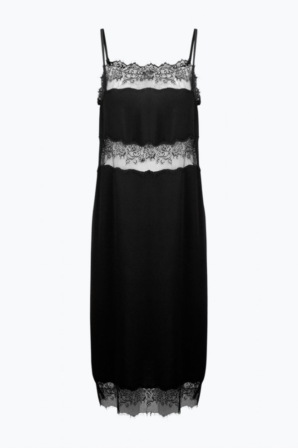 DAY Entree -mekko, jossa upotukset läpikuultavaa pitsiä. Hieman vartalonmyötäinen malli. Kapeat olkaimet. Napillinen halkio yläosassa molemmilla sivuilla. Pituus n. 119 cm koossa M. 100% viskoosia Istuvuus: regular Hienopesu 30°.