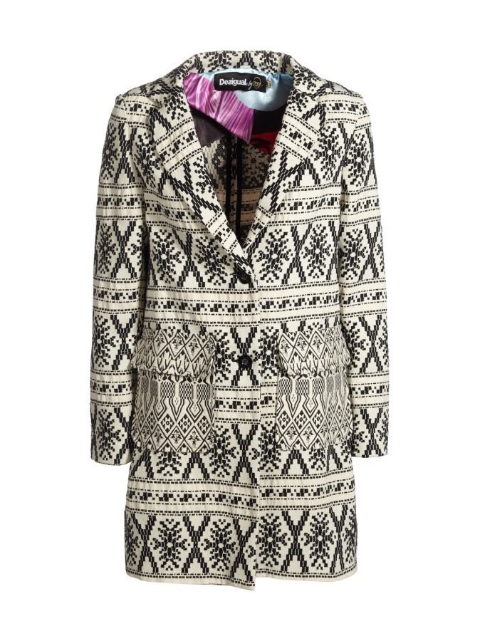 Kauniisti kuvioitu kaksivärinen takki on monikäyttöinen ja mukava päällä. Pehmeäpintaisessa takissa on läpälliset etutaskut ja takahelmassa halkio. Hihoissa ja sivuilla on ohut, sileäpintainen vuorikangas. Takki suljetaan kahdella napilla.