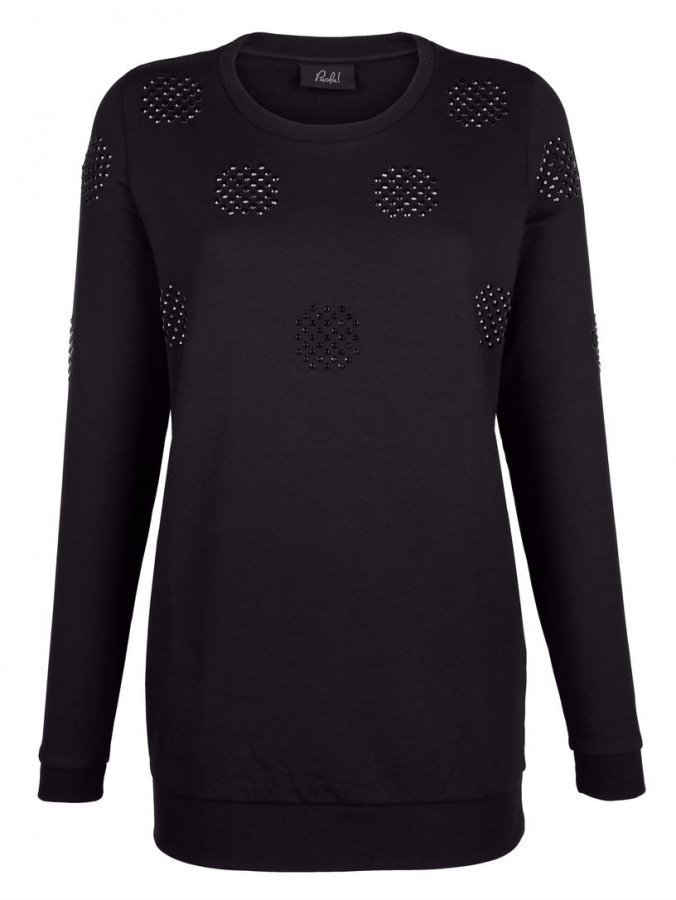Svetari, jossa etupuolella näyttävä laattakoristelu. Suora malli. Helposti yhdisteltävissä muihin vaatteisiin.