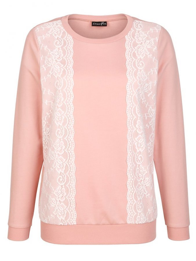 Svetari, jossa on pyöreä pääntie ja muodikasta pitsikangasta edessä. Hihansuissa ja helmassa ribbireunat. Suora malli.