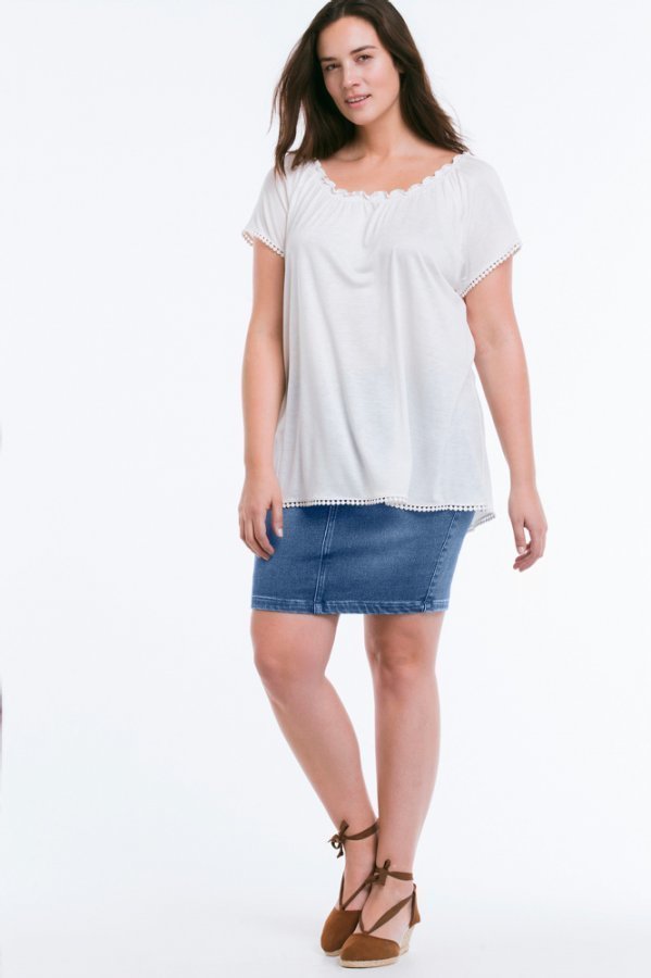 Mukava ja tyylikäs farkkuhame stretchtrikoota. Farkkusaumat ja kevyet kulutustehosteet. Kuminauha vyötäröllä. Pituus n. 50 cm koossa 42/44. 80% puuvillaa, 18% polyesteriä, 2% elastaania Istuvuus: regular Trikoota Pesu 40°.