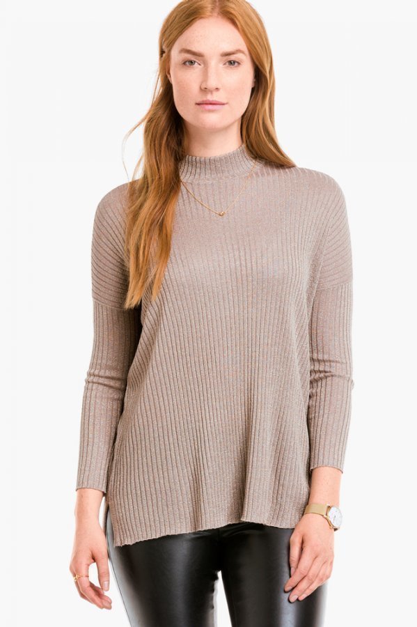Ohut pooloneule joustinneuletta. Puolikorkea turtleneck-poolokaulus. Neuleessa mukana metallilankoja, jotka antavat puserolle kauniin hohdon. Rento istuvuus ja madalletut olkapäät. Suora helma, joka on hieman pidempi takaa. Sivuhalkiot. Pituus n. 67 cm koossa 38/40. 80% viskoosia, 20% polyesteriä Istuvuus: relaxed Ohutta neuletta Hienopesu 40°.