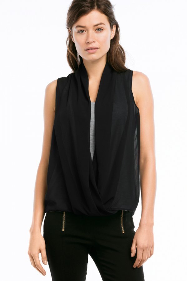 Hihaton toppi stretchtrikoota ja kangasta. Kaksinkertainen etuosa, jonka päällyskerros läpikuultavaa, kauniisti laskeutuvaa polyesterikreppiä. Saalikaulus. Kietaisumallinen helma. Normaali istuvuus. Pituus n. 66 cm koossa 38. 60% polyesteriä, 35% viskoosia, 5% elastaania Istuvuus: regular Trikoota, Hienopesu 40°.