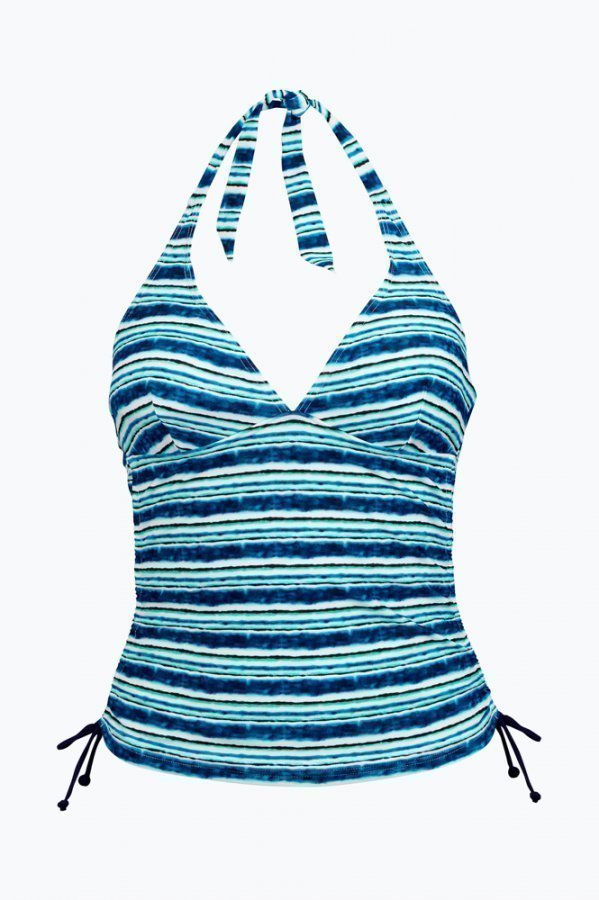 Halterneck-mallinen uimatoppi (niskasta solmittavat nauhat). Vuorilliset kupit, joissa irrotettava toppaus. Nyöri helmassa sivuilla. 80% polyamidia, 20% elastaania Pesu 40°.
