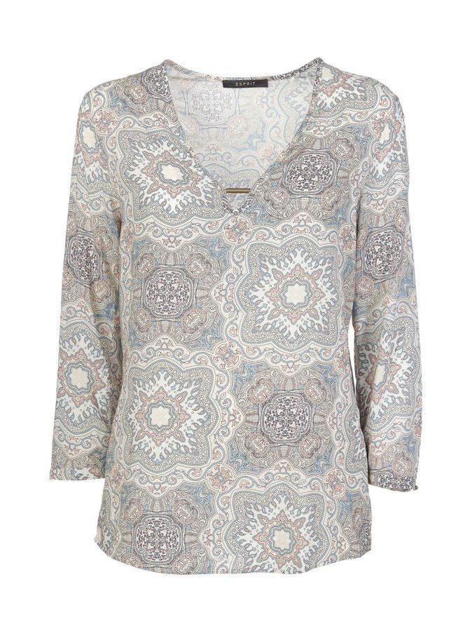 Keveää puseroa koristaa viehättävä paisley-kuosi. Paidan v-pääntiessä on metallinen somiste. Hihat ovat vajaamittaiset ja hihansuissa on napilliset halkiot.