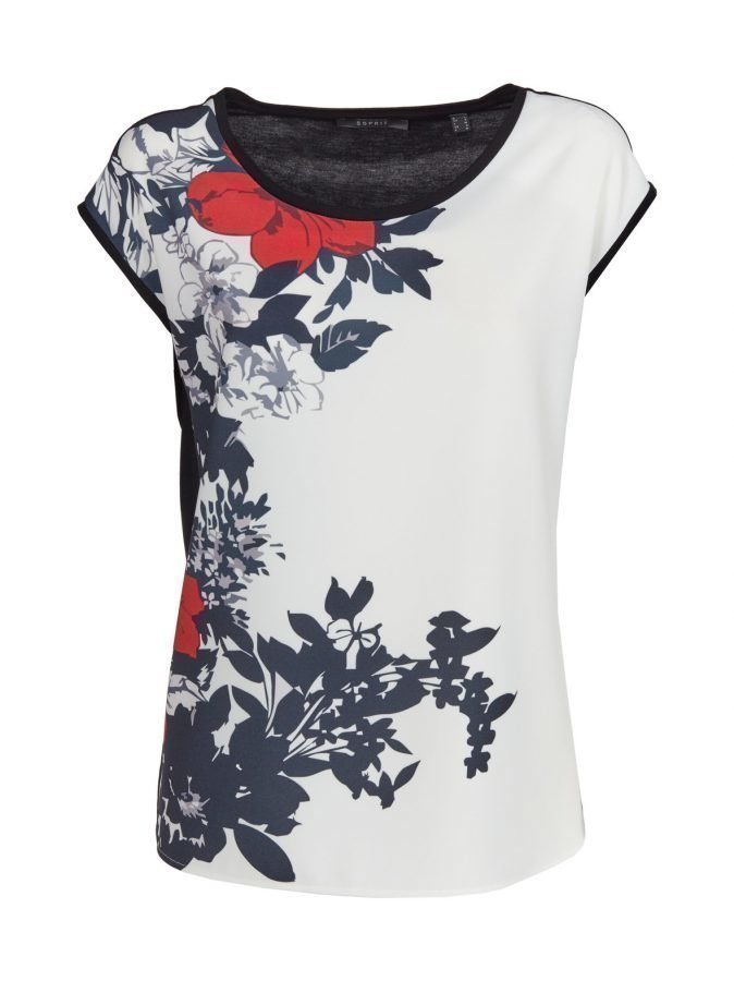 Lyhythihaisessa puserossa on väljä leikkaus ja laskeutuvassa etukappaleessa herkkä kukkakuviointi. Takakappale on viskoositrikoota.