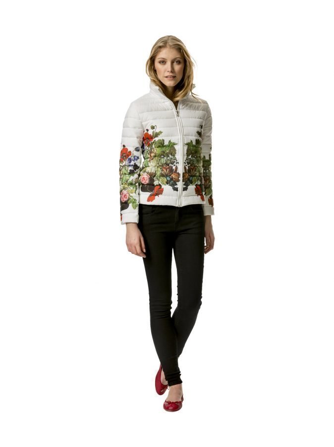 Lämmin tikkitoppatakki suljetaan vetoketjulla. Takin helmassa ja hihoissa on näyttävä kukkakuviointi. Takin pituus koossa 36 on 56 cm. Materiaali on 100 % polyesteriä. Konepesu.
