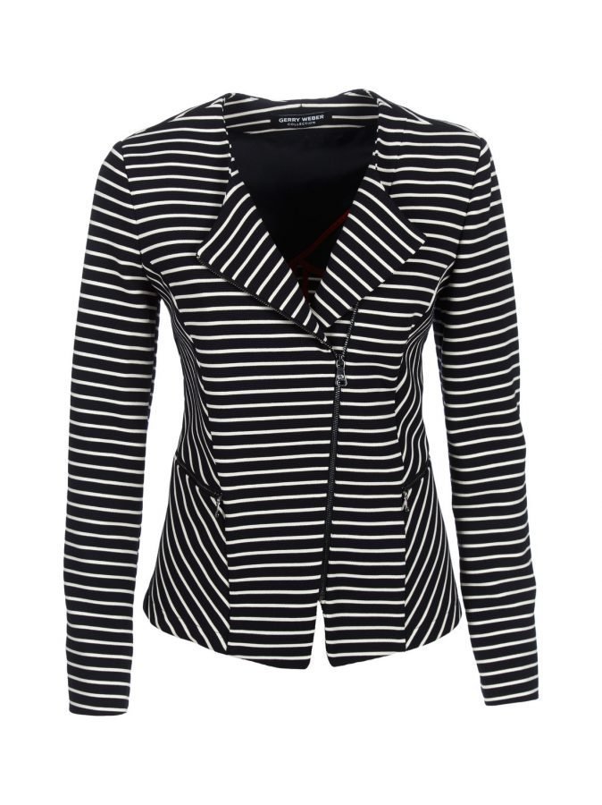 Tyylikkäässä jakussa on kevyesti eläväpintainen raidoitus ja vetoketjukiinnitteiset taskut edessä. Hihansuissa on halkiot. Jakku suljetaan vetoketjulla.