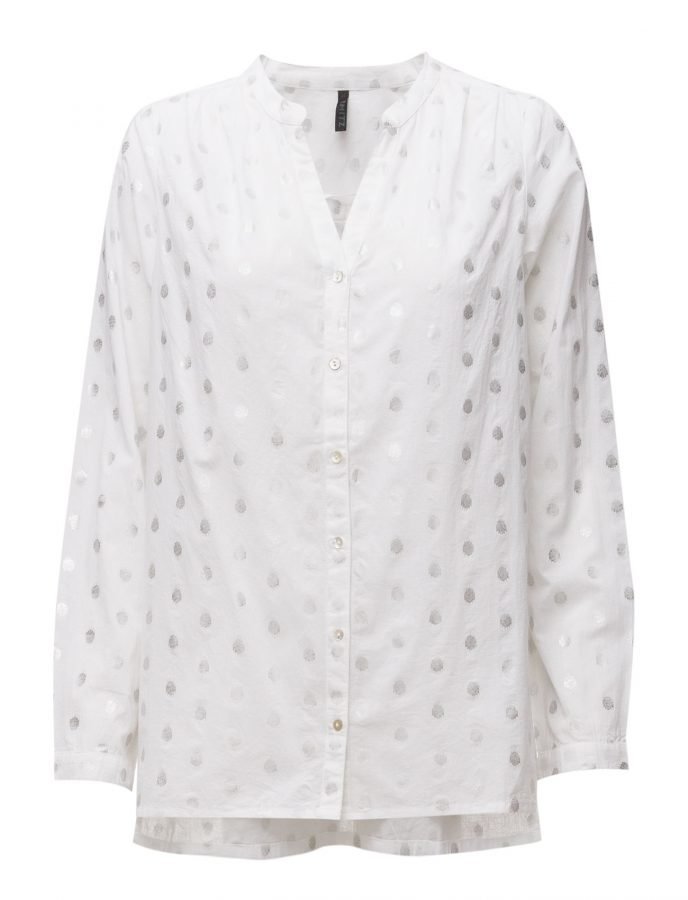 Imitz Valmistusmateriaali: 100% Puuvilla Väljä malli Nappilista edessä Mandariinikaulus halkiolla Metallinhohtoinen Polka-kuvio Laskostus selässä