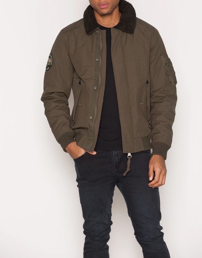 Jack & Jones -bomber-takki tekoturkiksella. Valmistettu 62 % puuvillasta, 38 % nylonista. Vuori 100 % nylonia. Kiinnitys vetoketjulla ja neppareilla. Kaksi etutaskua, joissa kiinnitys vetoketjulla ja nepparilla. Vetoketjutasku vasemmassa hihassa. Resorit hihansuissa ja helmassa. Applikaatio oikeassa hihassa. Lataa lehdistökuva Malli: Malli on 185 cm pitkä ja käyttää kokoa Medium. Tuotenro: 30329-1733