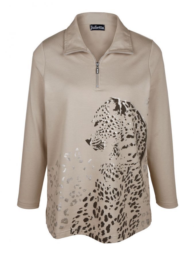 Naisellinen svetari, jossa mukava vetoketjukaulus. Edessä näyttävä leopardikuviointi. Helmassa sivuhalkiot.