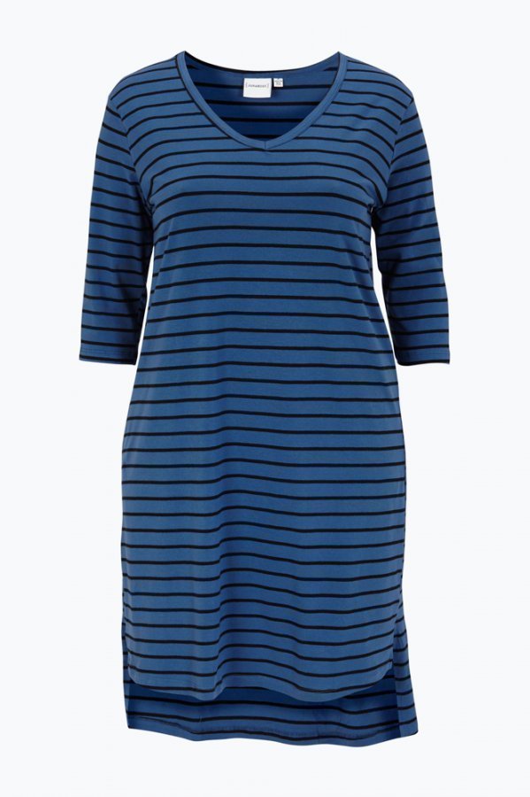 Junarose Calie -mekko raitakuosista stretchmateriaalia. Levenevä, mukavan väljä malli. Puolipitkät hihat. V-pääntie, jossa joustinneuloksinen nauhareunus. Helmassa pienet sivuhalkiot. Pidempi takakappale. Pituus takaa n. 104 cm koossa S. 92% puuvillaa, 8% elastaania Istuvuus: regular Trikoota Hienopesu 30°.